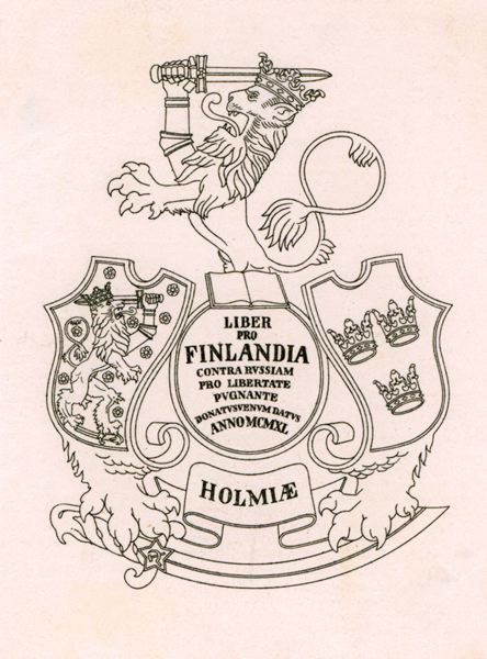 • Svart tryck på vitt papper. Vapen. Text: Liber pro Finlandia contra Russiam pro libertate pugnante Donatus Venum Datus ANNO MCMXL HOLMIAE