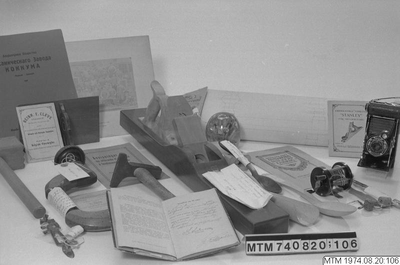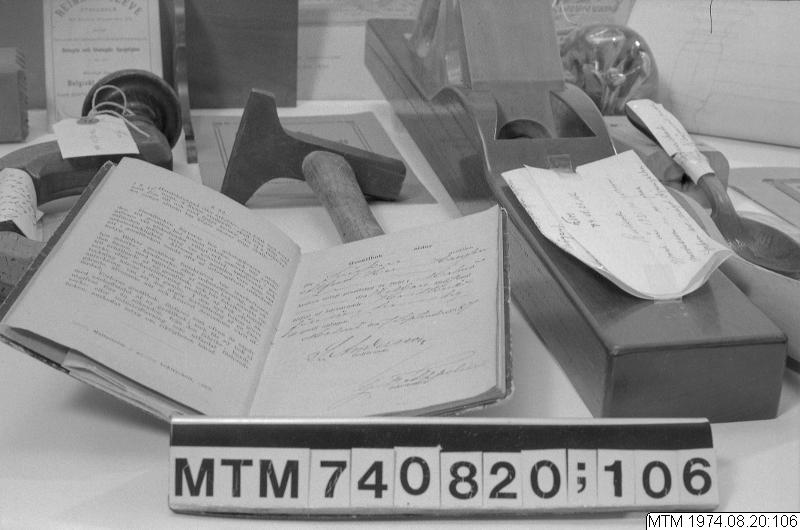 Arbetsredskap från konservatorsatelje: snickeriverktyg, skisser, trä- och gipsarbeten, bälgkamera för rullfilm, 6x9. Samlingen innehåller även handlingar och dokument rörande Erik Hansson far, Alfred Herman Hansson (1867-1951).