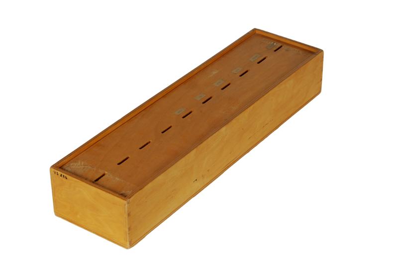 VS 286. Låda för ransoneringskuponger, i fernissad plywood. H. 92, L. 565, B. 150. Översidan utgör skjutlock i vilket finns 10 springor á 30x4 mm. Över 6 av dessa springor finns maskinskrivna etikett...