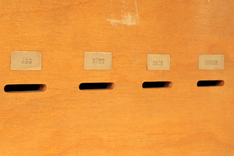 VS 286. Låda för ransoneringskuponger, i fernissad plywood. H. 92, L. 565, B. 150. Översidan utgör skjutlock i vilket finns 10 springor á 30x4 mm. Över 6 av dessa springor finns maskinskrivna etiketter: BRÖD; ÄGG; KÖTT; SMÖR; SOCKER; KAFFE. Använd i personalmatsalen under kriget. Brukare, ägare: Vipeholms sjukhus Förvärvat från: Vipeholms sjukhus Typ av förvärv: sparad