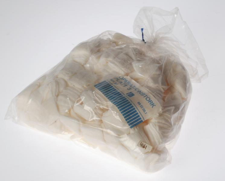 H 4161. Operationstork. "Platt 3". 500 stycken i transperent plastpåse. Ej sterila. Vit/ljusblå LIC-lapp i plastpåsen: "LIC Nr 892200.1". L 26,5 cm.