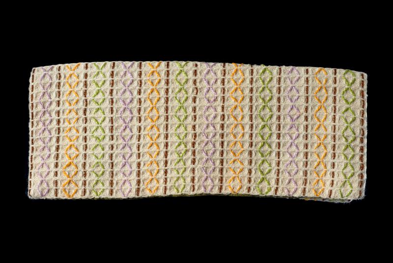VS 659. Servettväska av tyg - trädd söm i grönt-gult-skärt på vit-beige botten. L. 215, B. (med locket stängt) 85. Locket insida av grönt möbeltyg.