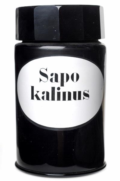 MS 216. Burk. H 176, Diam. 102 botten mm. Burk av svart glas med överfallande 12-kantigt lock. Schablonmålad oval etikett, vit med svart text: "Sapo Kalinus". Med innehåll. Brukare/ägare: Universitetsapoteket Svanen Förvärvat från: Universitetsapoteket Svanen Typ av förvärv: gåva