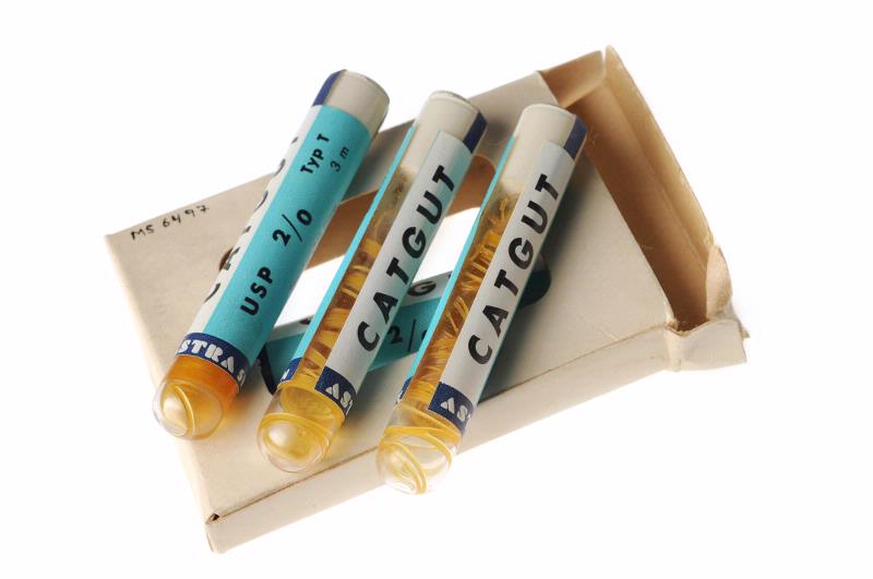 MS 6497. Catgut-tråd. I behållare av glas med sterilvatten. Plomberad. Märkta "Astra Sweden USP 2/0. Typ T. 3 m. Sterila enl intyg NF 2660-K. MF 1959:17". Turkos etikett. L 80 mm. D 13 mm. 5 st behållare ligger i ofärgad kartong med öppen ruta i var sida, 2 st ligger i annan kartong, 3 st saknas i denna. Märkta "O nr LL2215-6". Kartongerna märkta "Catgut 2/0". Kartongernas storlek 90 x 70 mm. Förvärvat från: okänt Typ av förvärv: okänt