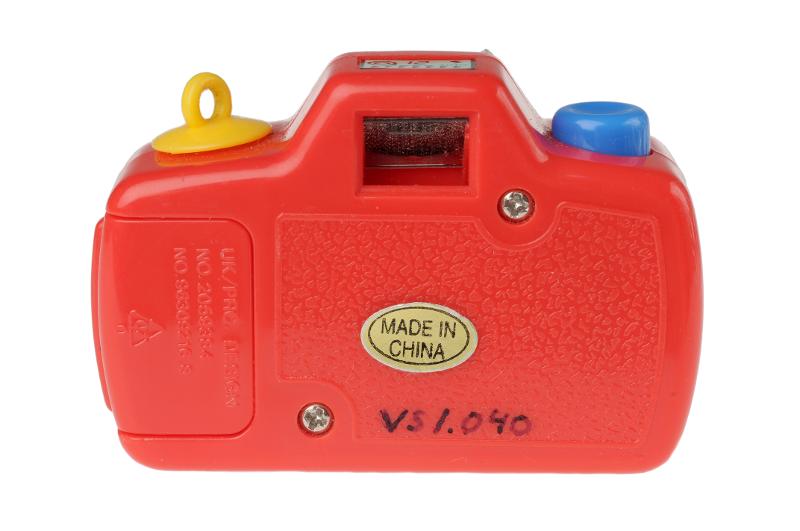 VS 1040. Leksakskamera; röd med blått, gult, grönt och grått. Text: "Super Zoom 327". B. 55, H. 40, D. 25. Har tillhört Nils [utelämnad uppgift], f.d. Vipeholmspatient. Samhör med VS 1026-1090. Gåva av personalen på Kullebo, Stehag, 2000-06-27. Brukare, ägare: Nils [utelämnad uppgift] Förvärvat från: Rökeholm Omsorg AB Typ av förvärv: gåva