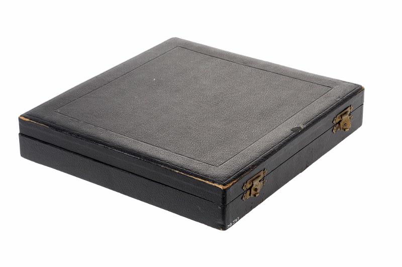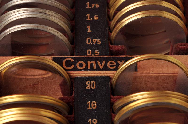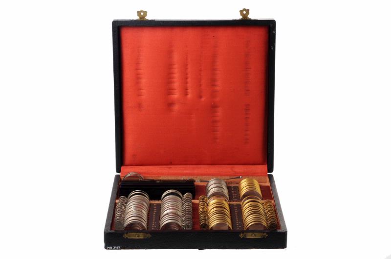 MS 3967. Glasögonlåda, svart och invändigt fodrad med röd siden och röd sammet, lådan knäpps med två spännen. Mått 270x265x50 mm. Innehåller: 15 par konvexa glas, 0,5, 0,75, 1, 1,5, 2, 2,5, 3,0, 4,0, 5,0, 6,0, 8,0, 10,0, 12,0, 16,0, 20,0 dptr (ett glas på 2,5 dptr saknas). 15 par konkava glas, samma dptr som föregående. 10 st cylinderglas, konvexa, 0,5, 0,75, 1,0, 1,5, 1,75, 2,0, 2,5, 3,0, 4,0, 5,0 dptr 10 st cylinderglas, konkava, samma dptr som föregående. 3 st nollglas, 2, 4, och 6 dptr. 4 st stenopeiska plattor, utan hål, med 1 mm hål, med 1 mm slits, med 2 mm slits. 8 st planglas, 4 st blå samt 4 st bruna. 1 st provbåge av metall. Förvärvat från: okänt Typ av förvärv: okänt