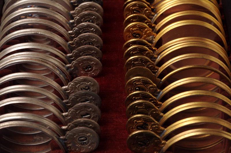 Är svart och invändigt fodrad med röd siden och röd sammet, lådan knäpps med två spännen. Innehåller: 15 par konvexa glas, 0,5, 0,75, 1, 1,5, 2, 2,5, 3,0, 4,0, 5,0, 6,0, 8,0, 10,0, 12,0, 16,0, 20,0 dptr (ett glas på 2,5 dptr saknas). 15 par konkava glas, samma dptr som föregående. 10 st cylinderglas, konvexa, 0,5, 0,75, 1,0, 1,5, 1,75, 2,0, 2,5, 3,0, 4,0, 5,0 dptr 10 st cylinderglas, konkava, sa...