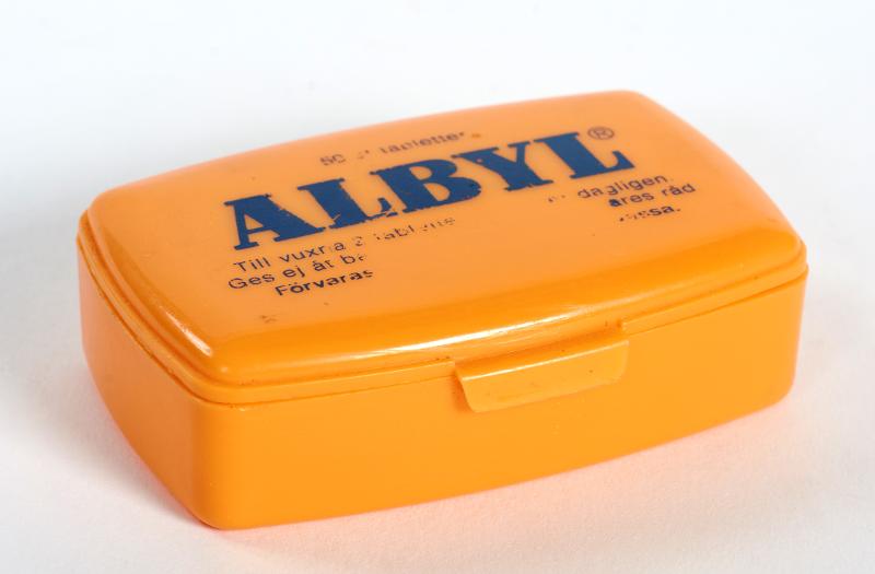 H 6804. Förpackning för läkemedel. Tillverkare: Aktiebolaget Leo. Mått: 7x5 cm. Gul, rektangulär plastask med rundade hörn. Blå text på locket: "50 tabletter Albyl". För värktabletter. Namnet är en kombination av Albumin och Acetyl. Albumin ersattes snart med magnesiumoxid då detta är skonsammare mot magen. Namnet Albyl kvarstod dock. Lit. hänv.: "Från Leopiller till Nicorette" av J. Ahlin och R. Lundgren. Funnen omärkt vid inventering 2013. Förvärvat från: okänt Typ av förvärv: okänt