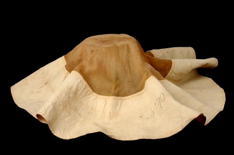 MS 605. Silduk. Nr 40, rund av brunfärgat tyg, kantad av beige bomullstyg. Diam hela 498 mm, silduksdelen diam 260 + 285 mm. Brukare, ägare: Universitetsapoteket Svanen Förvärvat från: Universitetsapo...