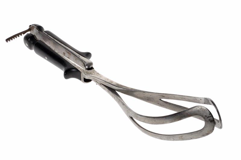 MS 762. Förlossningstång. L 350 mm. Av metall med svarta träbelagda handtag. "P. Walin" Lund".