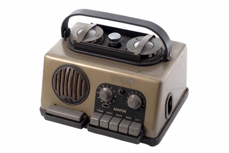 MS 1534. Diktafon. "Agafon". L 260 mm Br 190 mm H 185 mm. Av metall, beige och grå. Märkt: "Agafon Generalagent AB Bolinders Specialmaskiner", "Lunds lasarett". Handtag, typ grepe, på ovansidan. Meddelande (på recept) från Erik von Rosen medföljer. Utgår enligt liggare 1993-1994, men återfanns vid inventering 2008. Brukare, ägare: Lasarettet i Lund Förvärvat från: Lasarettet i Lund Typ av förvärv: gåva