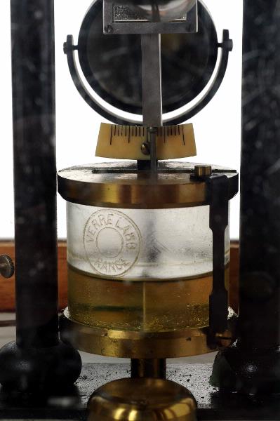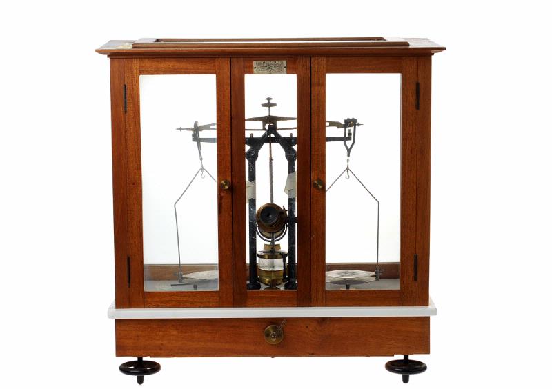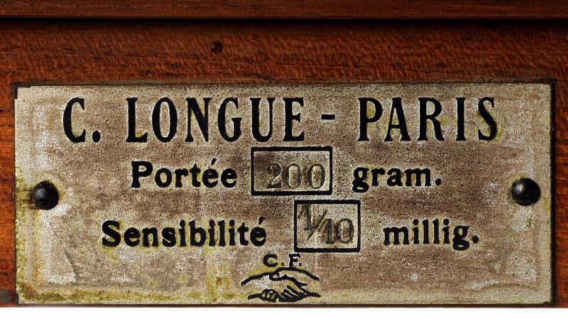 MS 1596. Precisionsvåg. Balansvåg. H 520 mm, L 500 mm, Br 260 mm. Skåp med två dörrar. Av trä och glas. Står på marmorskiva. Underrede av trä. Höj- och sänkbar genom utvändig skruv. Oljedämpare. Avläsningskikare. Bär 200 gr, känslighet 1/10 mg. Fabrik: C Longue Paris Frankrike. R III:8. Förvärvat från: okänt Typ av förvärv: okänt
