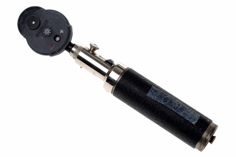 MS 9787. Oftalmoskop. L 220 mm. "American cystoskope", märkt "Wappler". Bottenplatta saknas. Gåva 1986 av Medicintekniska avdelningen genom Bo Eriksson.