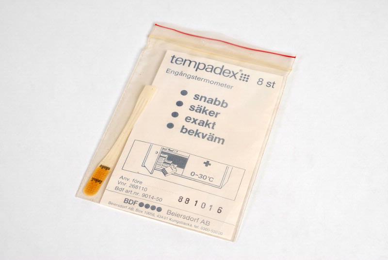 MS 9842. Engångstermometer. "Tempadex". 8 st. "Beiersdorf AB Kungsbacka. Termometerns L 190 mm. Gåva 1987 av Apoteket Gripen, Malmö genom apotekare Greta Roslund. Brukare, ägare: Apoteket Gripen, Mal...