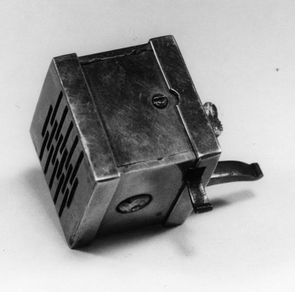 Koppningsinstrument från slutet av 1800-talet för uttömning av blod. Den fyrkantiga koppsnäpparen innehåller 12 skarpa klingor, som genom parallella springor i botten åker fram och skär igenom patientens hud och åstadkommer en måttlig blödning. Klingorna hålls tillbaka av en spärrhake, och genom en skruv kan skårans djup regleras. Medicinhistoriska samlingar i Lund före 1987.