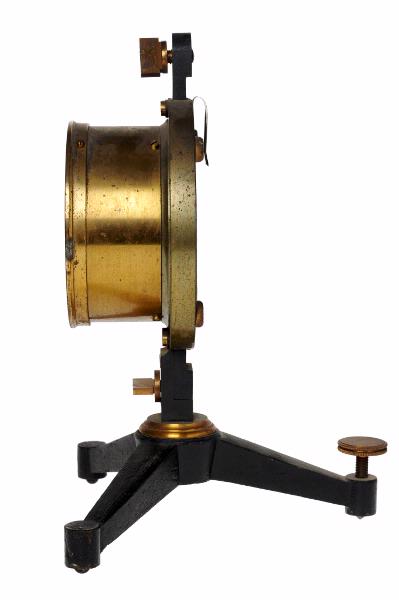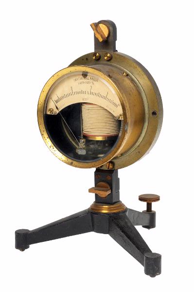 MS 6001. Vridspoleinstrument, amperemeter, metall. Rund metalldosa i gulmetall med skala och visare bakom glas. Gradering 0-5. Ovanför skalan märkt Hartmann & Braun, Frankfurt A/M samt under skalan AMP. Dosan fastnitad på järnstativ på tre ben. I en fot sitter en stor, rund skruv. Doasans Diam vid skalan 1250 mm. H totalt 310 mm, L dosan 60 mm. Förvärvat från: okänt Typ av förvärv: okänt