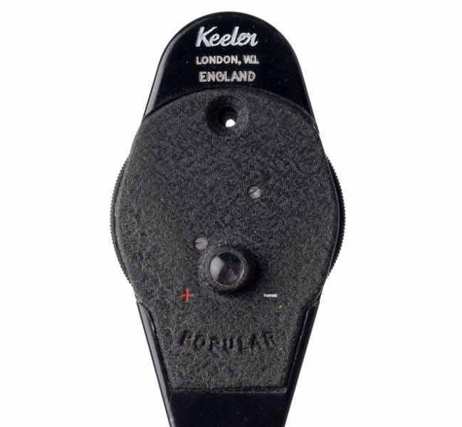 MS 10114. Oftalmoskop. "Keeler, London WL, England", grått skaft Nr 7603 C. L 230 mm Diam 35 mm. Gåva 1987 av Medicintekniska avdelningen genom Eriksson Bo. Förvärvat från: Medicintekniska avdelningen genom Eriksson Bo Typ av förvärv: gåva