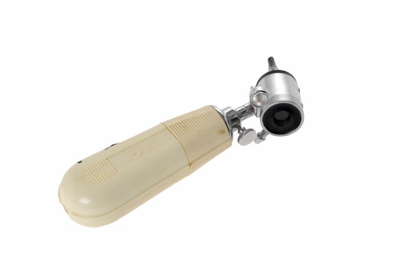 MS 10164. Otoskop. "Leo Hälsingborg" på skaftet. Örontratten av rostfritt stål och bakelit, Made in Germany. Otoskopets L 150 mm Br 35 mm. Tillhör MS 10155. Gåva 1987 av företagsläkare Åke Sköld, Rekt...