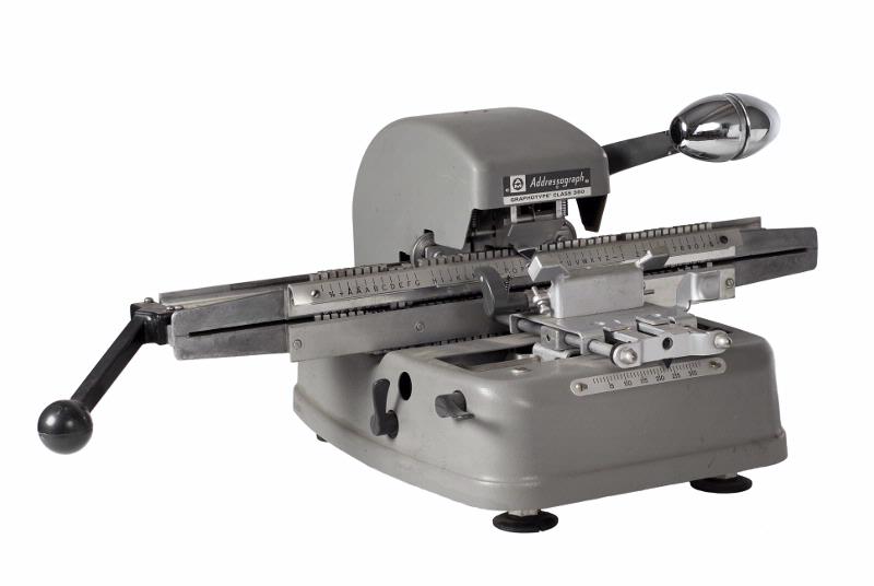 MS 10277. Adressograph. Av grålackerad metall. "Adressograph - Multigraph Corp., Cleveland, Ohio". H 245 L 625 Dj 380 mm. Sid-rörligt teckenställ med teckenskala och svart bakelithandtag. Stansspak me...
