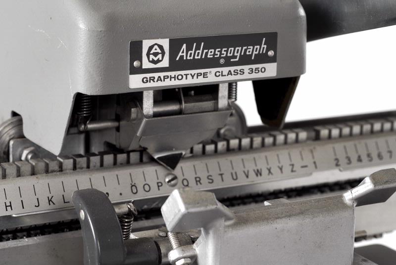 Grå. "Adressograph - Multigraph Corp., Cleveland, Ohio". Sid-rörligt teckenställ med teckenskala och svart handtag. Stansspak med äggformat, handtag. Adresskorthållare, rörlig i 2 riktningar mot sifferskalor. Märkta "Graphotype, Class 350. Model 355, Ser. 114238". Står på 4 svarta sugfötter.
