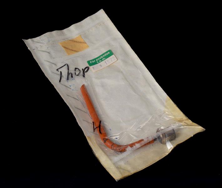 MS 11256. Trachealtub för barn enligt McIntosh, av rött gummi och med koppling av metall. Vinklad. L 155. "Trade mark LEYLAND Size 4 Made in England CTJ". Förpackad i sterilpåse av plast och papper, 200x100 mm. "MEDIPLAST Sterilizing Bag A-1". Etikett: "Får användas t.o.m. 7 5 1972". Märkt: "Th op 4". Gåva av COP II Anestesin 1988-07-15. Brukare, ägare: Thoraxkliniken, op Förvärvat från: Centraloperation II, anestesin Typ av förvärv: gåva