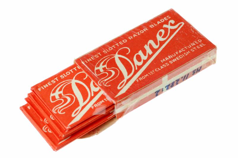 • Styckförpackade blad i röd ask med vit text: Danex finest slotted razor blades, 10 blades.