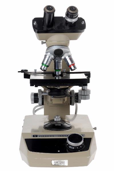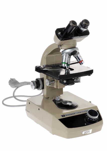 MS 11422. Mikroskop med gråbrun lackering. H 370, B 275x190. Rektangulär fotplatta med framtill avfasde hörn och sluttande framkant med svart inlägg och vred: 0-10. Märkt: "Vickers Instruments" rspektive "Preisler Malmö" (etikett). El-uttag på plattans baksida. Objekbord (svart) och kondensor separat höj- och sänkbara: Ställskruv märkt: "1 DIV ~ 2 µ". Fast revolverstativ med 3 objektiv från Vickers, England "100/1-3 OIL U 1107; 40/0-65. Y 1695; 40/0-65 T 7056". Svart hållare för 2 okular (tomma). Grå el-sladd, L 1500. Funnen omärkt i samlingarna. Förvärvat från: okänt Typ av förvärv: okänt