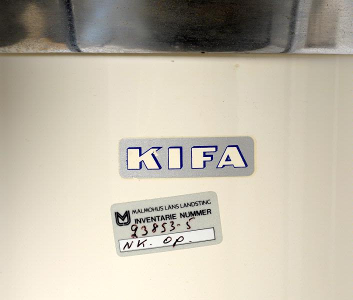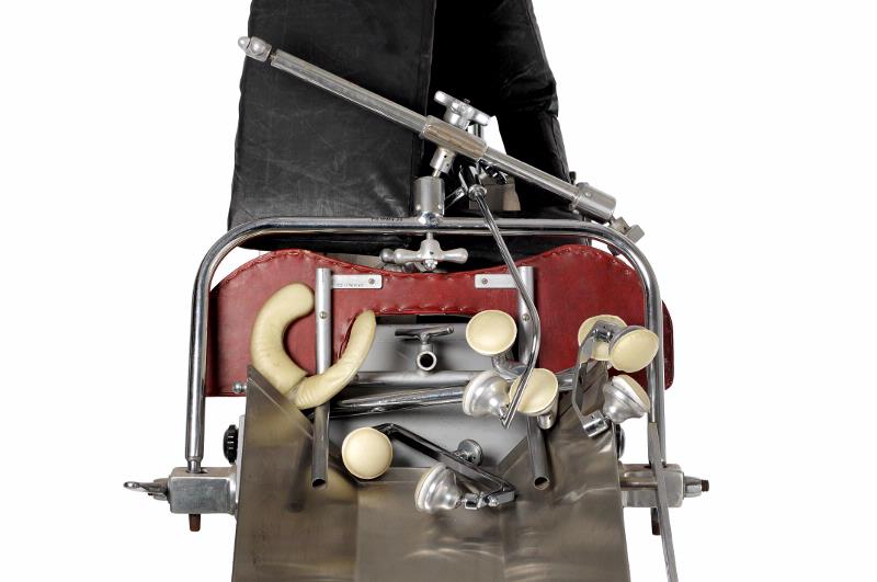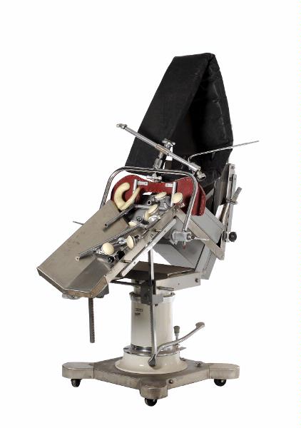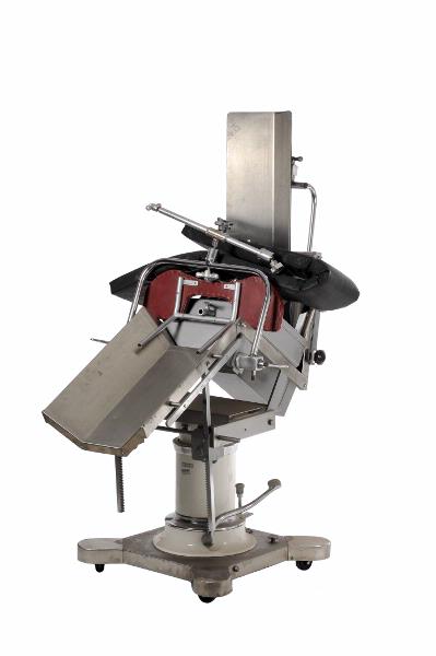 MS 10404. Operationsbord, mobilt - "Gardnerstol" - i rostfritt stål, H 1120, L 1150, B 750. MLL inventarienummer: 23853-5 / NK-op. Höj- och sänkbart fundament, delvis vitlackerat, på 4 hjul, KIFA. Operationsstol med reglerbar fram / tillbakalutning, "Ries Manufacturing Co, Hospital Equipment, 125 W. Central Parkway, Cincinnati, Ohio, 45202 U.S.A. Operationsbänk i rostfritt stål, H 290, L 1730, B 470; vinklad som ränna med 1 rektangulärt och 20 små runda hål i botten. Dyna med stoppning av skumgummi och hölje av svart galon, L 1650, B 235, Tjockl 55. Med rektangulärt hål, L 240, B 100, svarande mot liknande hål i operationsbänken. Tillbehör: 2 st rostfri plåt, L 915, B 255, vinklade ca 45° Armstöd, 2 st, rostfri plåt, L 440, B 110 Stöd, L 600, B 270x185; stomme av rör och trä, stoppning klädd med rött läder. Märkt: Sjukvårdstjänst AB, Malmö Huvudstöd, 5 st, av olika modell, av förnicklad metall, varierande L 18-450, med gula plastinbakade stoppningar (kuddar), varav 2 parentesformade och resten runda Hållare för för huvudstöd av förnicklad metall, H 490 Hållare av förnicklad metall bestående av 2 föenade med kulled, ena röret bockat, L 1300, det andra röret avtagbart, L 545 Tillbehör, trattformat, av rostfritt stål, utvändigt grålackerat, H 460, L 490, B 305; på undersidan 2 skenor Förlängningsdel av rostfritt stål, utvändigt grålackerat, H 29, B 440 Tillbehör av förnicklad metall, L 420, vingmutter i ena änden Tillbehör av metall, L 115 Vev av förnicklad metall, L 550 Vev av förnicklad metall, L 500 Stångjärn, vinkelböjt 90°, L 980+550, Diam 20 Från ca 1950. Delar från olika tillverkare sammanställt på Lasarettet. Gåva från Medicintekniska avdelningen genom Bo Eriksson. Brukare, ägare: Neurokirurgiska kliniken, op Förvärvat från: Medicintekniska avdelningen genom Bo Eriksson Typ av förvärv: gåva