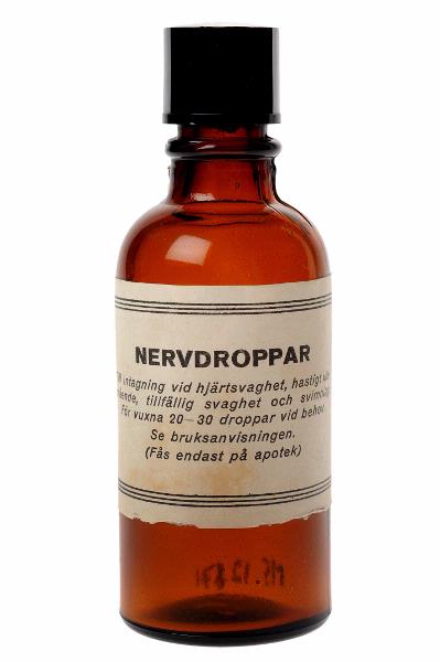 • Brun flaska med svart skruvlock. Vit etikett med texten: "Nervdroppar till intagning vid hjärtsvaghet, hastigt illamående, tillfällig svaghet och svimning...". Flaskan är utan innehåll. Placerad i medicinskåpet MS 12870. Nervdropparna är antagligen så kallade kamferdroppar. Blandningen, som bestod av kamfer, eter och starksprit, användes som nervlugnande medel och intogs ofta droppad på en sockerb... Visa hela