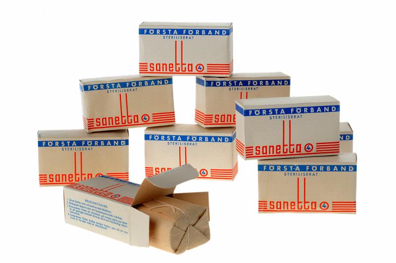 MS 12877. Första Förband. 14 st. Inslaget i ljusbrunt crépepapper, förpackad i beige pappkartong med röd och blå text, bl.a.: "Första Förband Steriliserat Sanetta 4". Kartong 80 x 30 x 45 mm. Placerad i medicinskåpet MS 12870. Gåva av Orupssanatoriet genom Tommy Alklind 1999-06-04. Brukare, ägare: Orupssanatoriet Förvärvat från: Orupssanatoriet genom Tommy Alklind Typ av förvärv: gåva