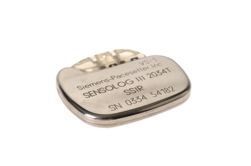 • MS 13439. Pacemaker. Av metall. L 5,2 cm Br 4,4 cm. Tillverkad av Siemens-Elema i Solna på 1980-1990-talet (?). "Siemens - Pacesetter Inc. Sensolog III 2034T SSIR SN 0234 54182". Funnen omärkt vid in... Visa hela