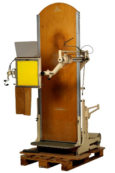 • I upprätt position med brits och grön tvärställd fotplatta. Gul kassetthållare märkt "Super Astral", finns på reglerbart stativ. Exklusive röntgenrör.