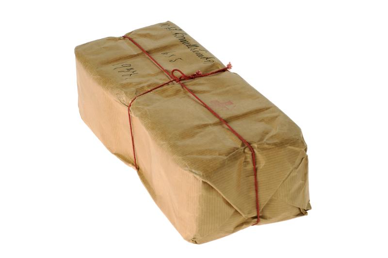 MS 13069. Förpackning med bomullsbinda. L 23 cm, B 10 cm, H 7 cm. Paket av brunt papper med rött snöre. Text på paketet: 10 st bomullsbindor 6x5 1937. Röda Korsets stämpel. Oöppnat paket. Inuti 10 st bomullsbindor. Funnen omärkt vid inventering 2009. Förvärvat från: okänt Typ av förvärv: okänt