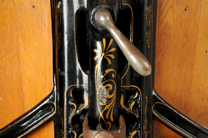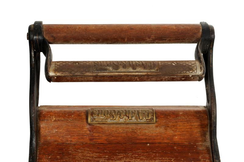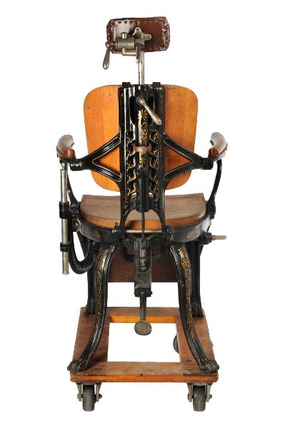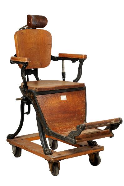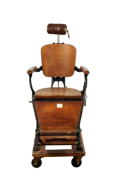 MS 13299. Tandläkarstol. Av järn och trä. Gjuten. L 42 cm Br 41 cm H 52 cm. Svartmålad järnkonstruktion med lejontassar. Dekorerad med guldfärgad blomsterornamentik. Armstöd, sits, rygg- och fotstöd är av trä. På stolen sitter en sentida klisterlapp: "Ash & Sons". Sannolikt "Morrisons Hospital Chair for dental Hospital and School", 1890-talet. Funnen omärkt vid inventering 2009. Förvärvat från: okänt Typ av förvärv: okänt