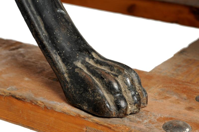 MS 13299. Tandläkarstol. Av järn och trä. Gjuten. L 42 cm Br 41 cm H 52 cm. Svartmålad järnkonstruktion med lejontassar. Dekorerad med guldfärgad blomsterornamentik. Armstöd, sits, rygg- och fotstöd ä...