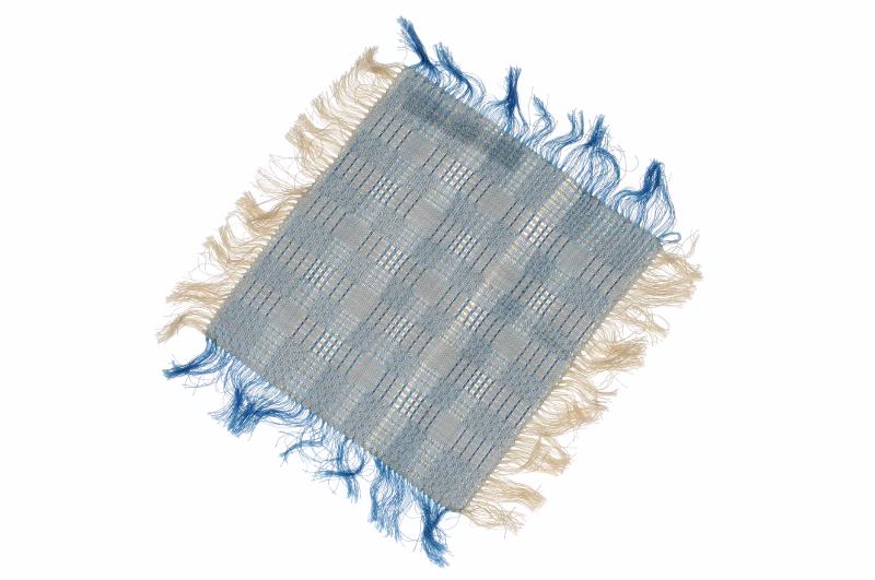 MS 12998.93. Vävprov. L 18 cm, B 16,5 cm, exkl. fransar. Konstsilke, mellanblå och naturvit. Drällmönster. Avslutad med oknutna fransar runt om. Förvärvat 2004 efter nedläggningen av Annetorpshemmet. Brukare, ägare: Annetorpshemmet Förvärvat från: Annetorpshemmet Typ av förvärv: gåva
