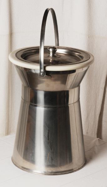 M 21. Latrinkärl, rostfritt, runt, raka sidor, med förstärkt utåtgående överdel, läggbart handtag, botten slutar på halva kärlet, så dess sidor fortsätter, något cylindrisk form, vit bakelitring, rostfritt lock med knopp. Kärl: H 41,5 cm, Diam 30 cm Ring: Tjkl 2,5 cm, Diam 31,2 cm Lock: [oläsligt], Diam 27,5 cm Brukare, ägare: Sankta Maria Sjukhus Förvärvat från: Sankta Maria Sjukhus Typ av förvärv: sparad