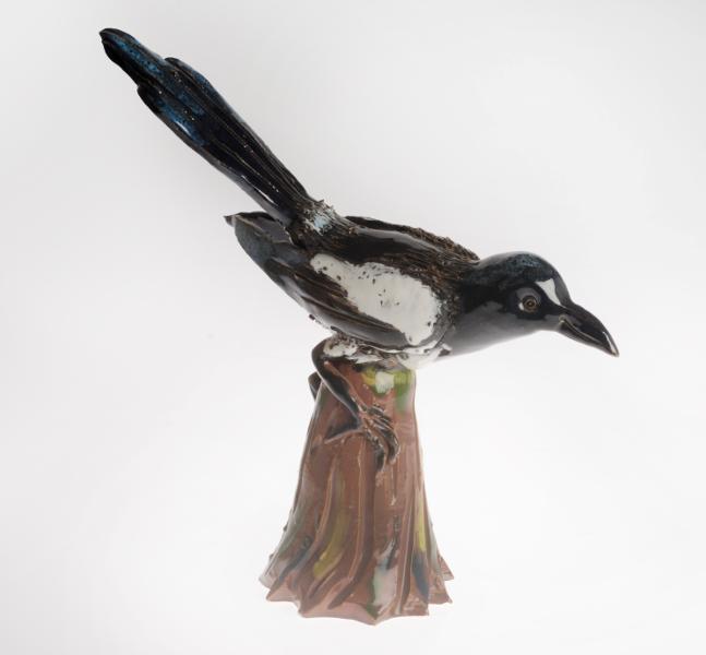 M 789. Skata. Av keramik. Svart och vit, sittande på grönmelerad stubbe. H 24,5 cm. Tillverkad på keramikverkstaden SMS. Gåva från Barbro Malm. Brukare, ägare: Sankta Maria sjukhus Förvärvat från: Barbro Malm Typ av förvärv: gåva