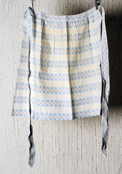 • M 808. Förkläde. 2 stycken. Midjemodell. Av bomullstyg. Märkta: "SOC. TERAPI". a) av blå-vit-grön-orange-grårandigt tyg. b) av blå-vit-grårandigt-rutigt tyg. Tyget är vävt på vävsalen SMS och sytt på ... Visa hela