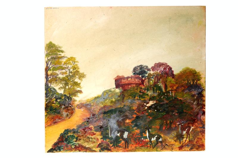 • STLM 2206. Målning. Målning i blandteknik vaxkrita-olja på skisspannå. Storlek: 35 x 31,8 cm. Motiv: " Hjortar i parken nedanför borgen". Målat av Rudolf Persson (1882-1939). Gåva av Ida Lindahl, Kli... Visa hela