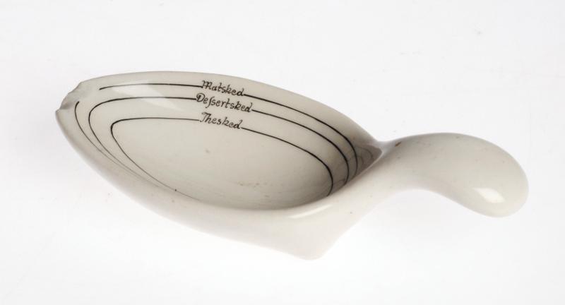 • Vit med gradering i form av 3 grå ringar i botten med texten: "Thesked Dessertsked Matsked".