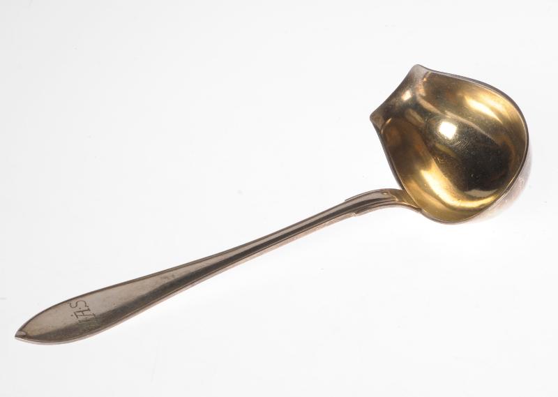 H 2884. Såsslev, nysilver, slät förutom inskription HÅS.L 17 cm, B 6,5 cm.