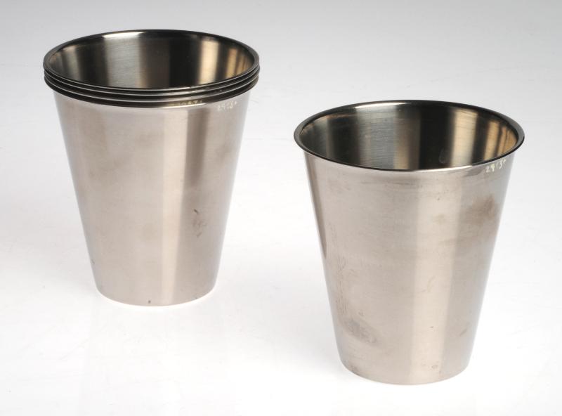 H 2913. Mugg, rostfri stål, 5 st, runda med raka väggar, tillverkare METEKTRO, Stockholm. Alla 5 st är märkta K2 (Kirurgen 2) med tuschpenna. H 9,3 cm, Diam 8,9 cm. Brukare, ägare: Kirurgiska klinike...
