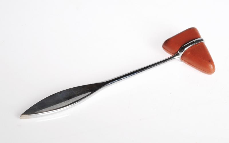 H 2560. Perkussionshammare. Skaft av rostfritt stål. Hammarhuvudet av rött gummi. Enligt Taylor. L 19,7 cm Br 5,4 cm.