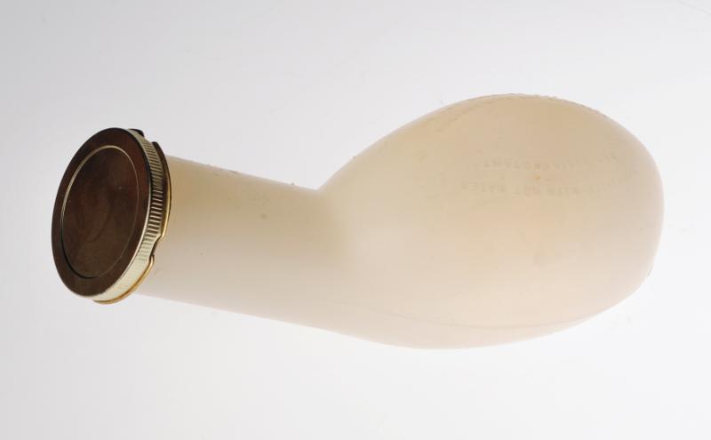 • H 2564. Urinflaska. Av hårdplast. Tillverkare BEX England. Med lock i gulmetall. L 24 cm Br 10 cm.