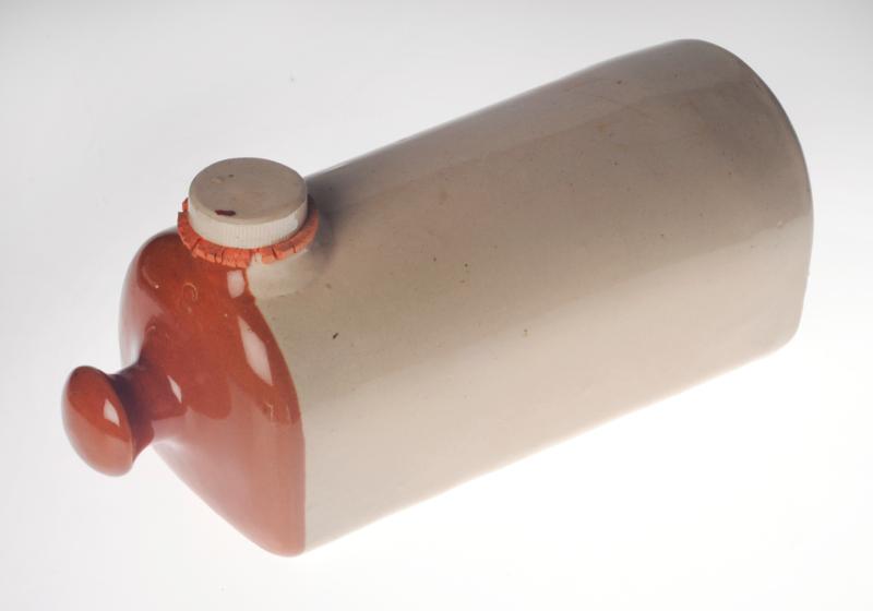 H 3123. Sängvärmare, engelsk typ, grått stengods med en brunglaserad gavel, rektangulär med halvsfärisk översida, hål på ena sidan med ett gummiförsett skruvgängat lock av grått stengods, knopp i ena sidan. a. L 25 cm, B 11,8 cm, H 11,4 cm. b. H 4 cm Diam 4 cm. Förvärvat från: okänt Typ av förvärv: okänt