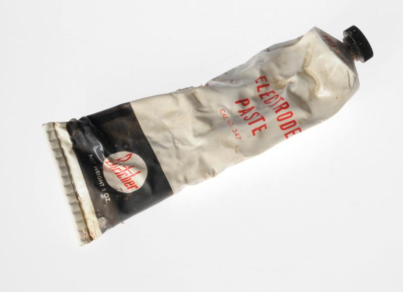 H 3613. Tub med elektrodsalva. Vit med grå nederdel och svart skruvkork. Oregelbunden tryckt form. Bruksanvisning på amerikanska på tuben samt märkt: "ELECTRODE PASTE CAT. NO. 347 BIRTCHER NET WEIGHT 5 OZ...". L 15,2 cm Br 4,5 cm. Trasig mitt på. Förvärvat från: okänt Typ av förvärv: okänt