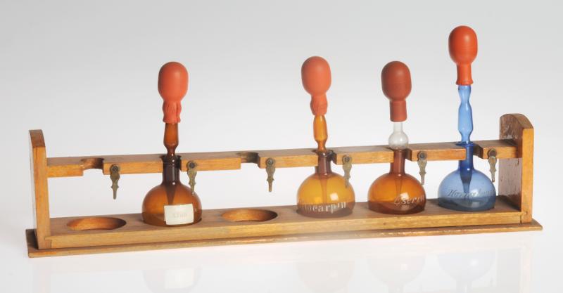 H 3413. Ställ i trä med 5 st pipetter, olika färg, röd gummiblåsa märkt Russica, flaskorna olikt färgade av tunt glas, kort hals, stället ljusfärgat gavelförsett med metallspärrar, plats för 6 st pipetter. a) ställ, L 34,2 cm, B 6,1 cm, H 7,4 cm b) pipett, blå, märkt: Homatropin, H 13,4 cm, Diam 2,4 cm c) pipett, brun-gul, märkt: Alun, H 10,7 cm, Diam 2 cm d) pipett, brun-gul, märkt: Pilocarpin, H 11,9 cm, Diam 2,2 cm e) pipett, brun-gul, märkt: Eserin, H 11,9 cm, Diam 2,6 cm f) pipett, brun-gul, märkt: Lucosil, H 11,5 cm, Diam 2 cm Förvärvad från Dr. Daniels. Brukare, ägare: Dr Daniels Förvärvat från: Dr Daniels Typ av förvärv: gåva
