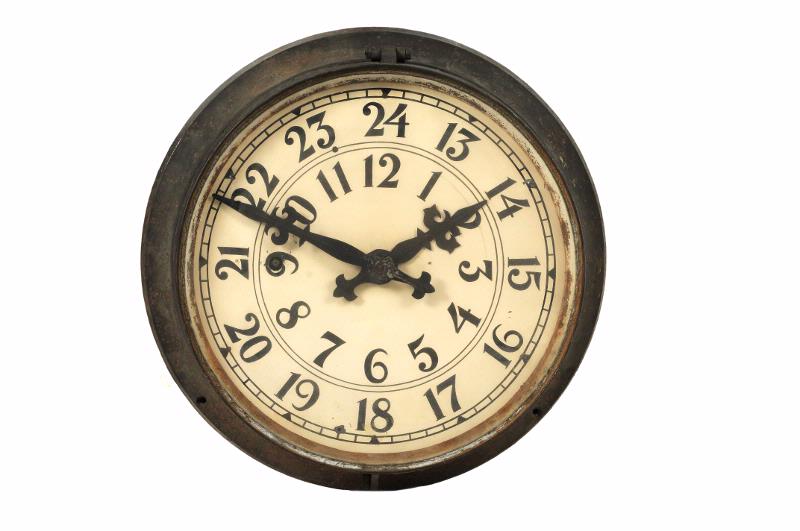 Rund, låsbar av järn, glas mm. Urtavlan skyddas av glas i metallram som är fäst med gångjärn i överkanten. Dubbel sifferring (1-12, 13-24). Upphängningsögla upptill på baksidan plus 2 st. skruvhål nedtill. Rostskador på klockhöljet. Har suttit utomhus på Administrationsbyggnaden.