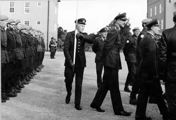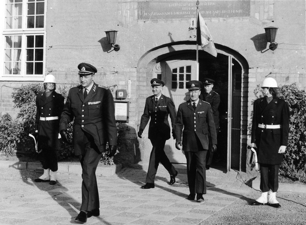 Bild 1 Ut från kanslihuset kommer arméchefen general Carl-Erik Almgren, överste Karl-Gustav Norderup Ast/FN, överste Stig Colliander och standarförare (ur P 10/Fo 43) löjtnant Lars Liljenstolpe.